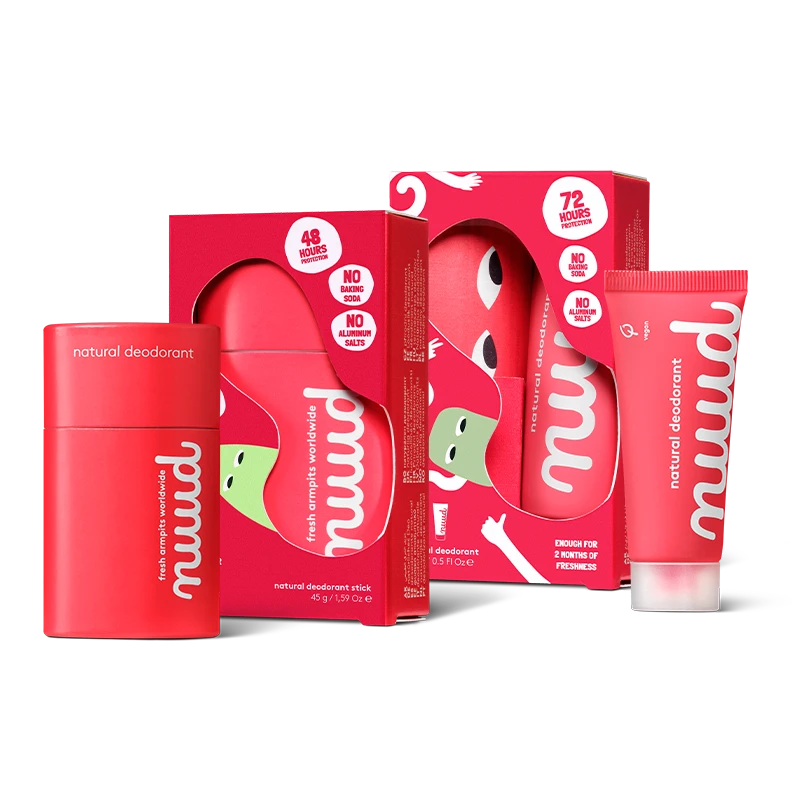Huile de coco**, amidon de maïs*, cire de tournesol*, cire de baies de myrica*, huile d'olive**, citrate de triéthyle (ingrédient actif déodorant d'origine végétale), cire végétale, émollient végétal*, émulsifiant à base d'huile de macadamia*, sel d'acide lactique*, vitamine E*, oxyde de zinc*, huile de tournesol*, argent*, émollient végétal*, épaississant végétal*